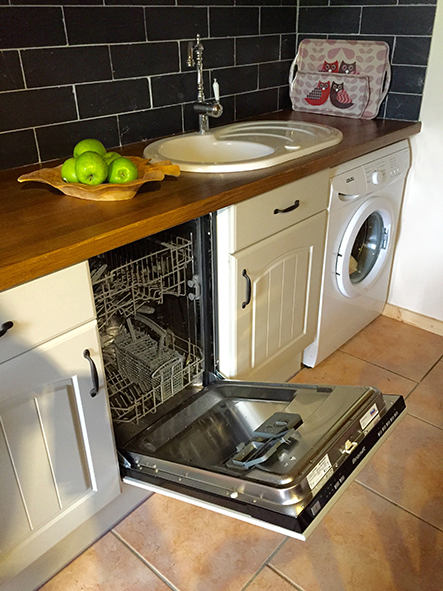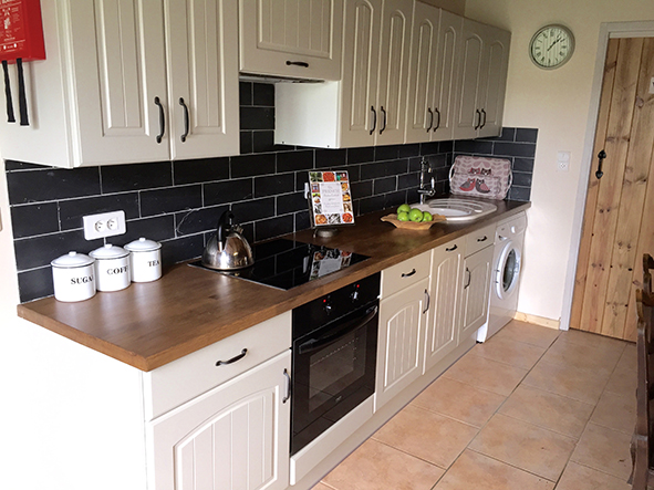 The kitchen provides ample work top space and storage.There is a fridge with freezer box, an oven, hob with extractor and microwave for cooking along with all the crockery you may need. There is also a washing machine and built in dishwasher. The dining table provides seating for up to six people.