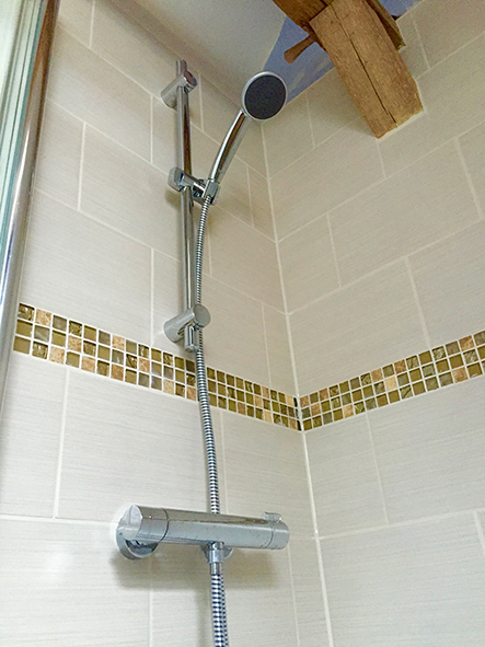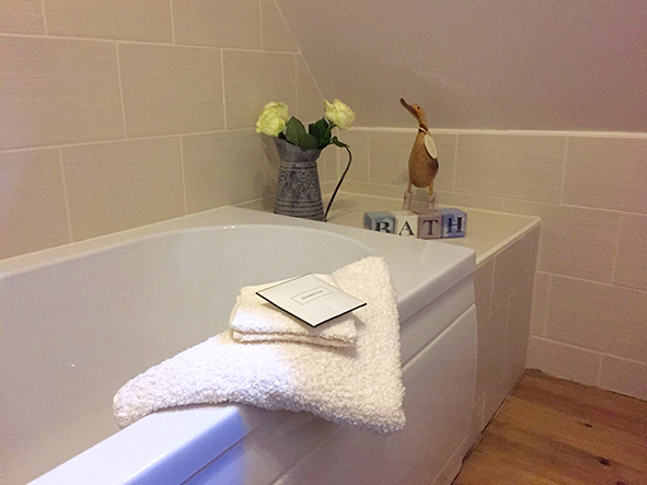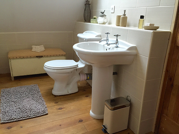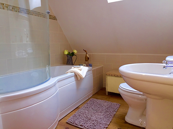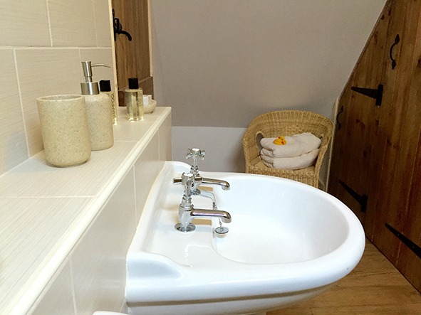 The bathroom also features original wooden beams. Fitted with luxury fittings, there is a toilet, sink and full sized shower bath with power shower.